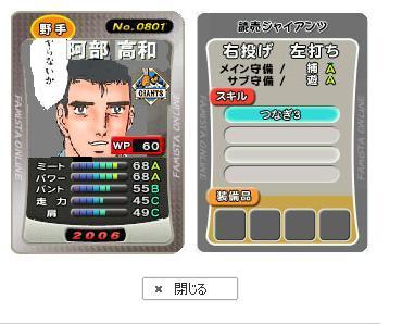 現状では ロッテ 林、寺本 ソフトバンク 鳥越、井出竜、大道 西武 現状では0人 オリックス 谷、ブランボー、日高、ガルシア、塩崎 日本ハム 岡島、小笠原道、マシーアス 楽天 現状では0人 阪神 オクスプリング、スペンサー 中日 現状では0人 横浜 門倉、小田嶋 ヤクルト 現状では0人 巨人 佐藤宏、鴨志田、小久保、仁志、堀田、黒田 広島 現状では0人 解雇決定済みのアレックスが残ったりしているので 単純に契約更改決裂→カタログ即抹消ではない模様です。 30日のメンテで選手カードが追加&減少したようです。 新人王・・・既存のTHスキルがつく。また、基本能力も若干上昇。 各球団優秀選手・・・既存のSP選手の能力に更にスキル1を付属させたもの。基本能力も若干上昇。 また、移籍決定選手の一部がカタログから姿を消した・・・ 参考までに特殊能力リスト(攻撃時) ・チャンス:ランナーが得点圏にいる時に発動。 ・先頭打者:その回のトップバッターなら発動。 ・固め打ち:1席目にヒットを打つと発動。ファミスタクオリティだとゲッツー崩れでも発動する模様。 ・つなぎ:前のバッターが出塁すると発動。安打のみなのか四死球を含むのかは不明。 ・サヨナラ:一打サヨナラのチャンスで発動。 ・内野安打:内野ゴロを打った時に発動と思われるが、外野フライを打った時にもエフェクトを確認した。 ・盗塁:盗塁時の走力がアップする。 ・満塁:満塁時に打席に立つと発動。 ・対左投手:左投手と対戦時に発動。 ・代打:代打で打席に立つと発動。 特殊能力リスト(投手) ・負けん気:負けている時は常時発動。 ・方程式:勝っている場面で投入すると1イニング発動。同点or逆転されてもそのイニングは持続する。 ・序盤好調・中盤好調・終盤好調:1回・5回・8回にそれぞれ1イニング発動。 ・対左打者:左打者相手に発動。 ・バント処理:バント処理時、肩が上昇。 特殊能力リスト(守備時) ・肩:走者進塁中に送球すると発動。肩上昇。 ・盗塁阻止:盗塁中の走者を刺す時に肩が上昇する。 THスキル ・不屈→負けん気4 ・~絶好調→~好調4 ・守護神→方程式4 ・クラッチヒッター→チャンス4 ・スピードスター→盗塁4 ・猛打→固め打ち4 ・チャンスメーカー→先頭打者4 |
